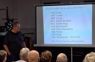 Im zweiten Teil zu den Bürgermeistern in Blofeld konnte Friedel Schmidt eindrucksvolle historische Fotos von den dörflichen Aktivitäten zur Aufstellung eines Maibaumes vor dem Haus des jeweiligen neugewählten Blofelder Bürgermeisters sowie Kopien von Ernennungsurkunden zeigen. Und auch Pressemeldungen zur Ernennung der aus Blofeld stammenden Reichelsheimer Bürgermeisterin Lena Herget fehlten nicht.