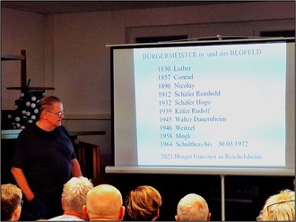 Wiederum mehr als 30 Besucherinnen und Besucher folgten der gemeinsamen Einladung des Heimat- und Geschichtsvereins Reichelsheim e.V. (https://reichelsheim-wetterau-wiki.de) und des Trägervereins Blofelder Dorftreff e.V. (www.blofeld-online.de) zu einem weiteren Fotovortrag zur Blofelder Dorfgeschichte. Der Blofelder Dorfchronist Friedel Schmidt hatte sich aus seinem großen Fundus an Anekdoten, Urkunden, Fotos und Videos zur Geschichte Blofelds dieses Mal drei Themen herausgesucht: die Entstehung des Dorfgemeinschaftshauses und des großen Spielplatzes am DGH, die Durchgangs- und Landstraßen rund um Blofeld, sowie die Bürgermeister der eigenständigen Gemeinde Blofeld von 1830 an.