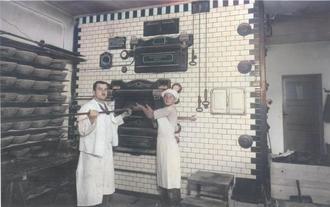 Eine Aufnahme vor dem Ofen in der Dampfbäckerei Diehl um 1930