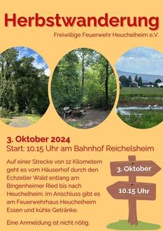 Am Donnerstag, 3. Oktober, findet wieder die alljährliche Herbstwanderung des Feuerwehrvereins Heuchelheim statt. Um 10.15 Uhr geht es am Bahnhof Reichelsheim los. Auf einer Strecke von zwölf Kilometern geht es vom Häuserhof durch den Echzeller Wald entlang am Bingenheimer Ried bis nach Heuchelheim. Im Anschluss gibt es am Feuerwehrhaus Heuchelheim Essen und kühle Getränke. Eine Anmeldung ist nicht nötig.