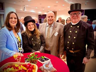 vlnr: Bürgermeisterin Lena Herget, Schornsteinfegermeisterin Isabell Gies, Stadtverordnetenvorsteher Holger Strebert und Bezirksschornsteinfegermeister Reiner Scholl begrüßen die Gäste des Neujahrsempfangs der Stadt Reichelsheim.