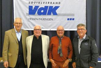 Vorsitzender Gerd Wagner (links) und Vize-Vorsitzender Manfred Winter (rechts) zeichneten Roland Metzger (2.v.l.) für 25-jährige Mitgliedschaft und Jürgen Neurath (2.v.r.) für seine Verdienste mit der Ehrenplakette des VdK Hessen-Thüringen in Bronze aus.