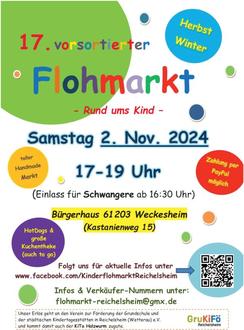 Am 2. November 2024 von 17 bis 19 Uhr findet wieder der bereits weit über Reichelsheims Grenzen hinaus bekannte, sortierte Kindersachen-Flohmarkt im Bürgerhaus Weckesheim (Kastanienweg 15 in 61203 Reichelsheim) statt. Engagierte Eltern, die diesen Flohmarkt ehrenamtlich organisieren, sorgten schon mehrfach dafür, dass der Erlös aus den Flohmarkt-Verkäufen an den örtlichen Förderverein zur Unterstützung der Grundschule im Ried in Reichelsheim sowie der städtischen Kindertagesstätten in Reichelsheim (kurz: GruKiFö) geht. Der GruKiFö finanziert unter anderem der Kindertagesstätte Holzwurm sowie der Grundschule im Ried besondere Aktionen oder Anschaffungen.