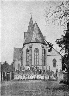 Dieses Foto fand sich beim Blättern in den Reichelsheimer Heimatglocken vom September 1929. Die Heimatglocken waren das Mitteilungsblatt der evangelischen Kirche mit allgemeinem und kommunalem Teil. Im Jahr 1929 für die Gemeinden Reichelsheim und Dorn-Assenheim - ab 1930 auch für Weckesheim. Verantwortlich für den örtlichen Teil war der Ortsgeistliche von Reichelsheim - zu dieser Zeit Pfarrer Karl Rühl. In dem Text zu dem Bild schreibt er: Wir bringen in dieser Nummer wieder einmal ein Bild unserer schönen Kirche. Es ist von der Ostseite her vom Römerberg gesehen und zeigt den Chor, der heute innen wieder in seiner ganzen ursprünglichen Schönheit hergestellt ist, aber auch von außen in seinen großen aber feinen Abmessungen ein prachtvolles Bild bietet. Die Aufnahme ist schon vor einigen Jahren gemacht, die Schulkinder die darauf zu sehen sind heute schon mitten im Leben. Vielleicht erinnert sich noch manches an den Tag, da es sprang, um "auch mitdrauf zu kommen". Auch die beiden Herren Lehrer Schäfer und Wenzel sind darauf - wer findet sie?