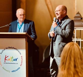 Schon bei der Begrüßung in der Reichelsheimer Kultur- und Eventscheune wurde deutlich, dass eine besondere Veranstaltungsreihe zu Gast war: Neben dem Vorsitzenden des Vereins „Kultur in Reichelsheim e.V.“ Horst Steuernagel trat auch der ehemalige Wölfersheimer Bürgermeister Rouven Kötter mit auf die Bühne. „Als Bürgermeister durfte ich die erste Lesung von Herbert Meyer und Gerd Wächter 2010 im Rathaus ermöglichen, anschließend war ich immer Zuschauer, wenn es mir möglich war. Daher ist es mir eine besondere Freude, heute als Mitglied des Reichelsheimer Kultur-Vereins die Fortsetzung dieser Lesungsreihe in meiner neuen zweiten Heimat Reichelsheim begrüßen zu dürfen“, so Kötter.
