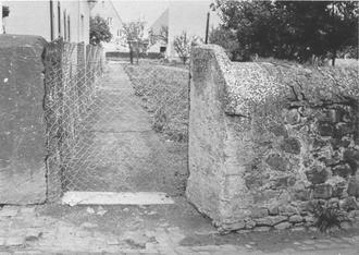 Hier verlief der Trampelpfad vom Baugebiet "Am Haingraben" zur Oberen Haingasse. Rechts ist noch ein Stück der Mauer des Pfarrgartens zu sehen, welche seinerzeit am Ortsrand an der Oberen Haingasse verlief und den Pfarrgarten abgrenzte. Im Hintergrund sind die ersten fertiggestellten Neubauten der Straße Am Haingraben zu sehen.