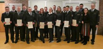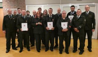 Die geehrten Feuerwehrangehörigen: Alexander Hitz (Leistungsabzeichen Gold "5"), Stadtbrandinspektor Nicklas Rodriguez, Alexander Finkeldey (Leistungsabzeichen Bronze), Benjamin Winkler (Silbernes Brandschutzehrenzeichen), Steffen Guth (Leistungsabzeichen Gold), Dario Bäumner (Leistungsabzeichen Eisen), Stefanie Strebert (Leistungsabzeichen Eisen), Nico Jung (Leistungsabzeichen Bronze), Rebecca Fulle (Leistungsabzeichen Eisen), Michael Paulencu (Goldenes Brandschutzehrenzeichen), Benjamin Freiter (Silbernes Brandschutzehrenzeichen), Jörg E. Heinzig (Silbernes Brandschutzehrenzeichen), Michael Schlierbach (Silbernes Brandschutzehrenzeichen), Vize Stadtbrandinspektor Markus Ritter und Kreisbrandmeister Jens Christiansen.