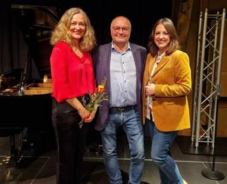 Pianistin und Kabarettistin Anne Folger mit Horst Steuernagel (1. Vorsitzender Kultur in Reichelsheim e.V.) und Bürgermeisterin Lena Herget