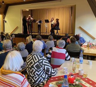 Knapp sechzig Seniorinnen und Senioren kamen zum diesjährigen weihnachtlichen Zusammensein der Ev. Kirchengemeinde Beienheim/Weckesheim ins Gemeindehaus im Brunnenweg. Nach der Begrüßung, den Gratulationen an alle Jubilare, dem Dank an alle Kaffee-, Kuchen- und Geldspendern stand dem weiteren Ablauf nichts mehr im Wege. Pfarrerin Kerstin Tenholte erfreute Alle durch ihre Anwesenheit. In Ihrer erfrischend, unterhaltsamen Art stimmte sie uns mit einer weihnachtlichen Andacht auf das Fest ein. Abschließend erzählte sie eine besinnliche, tierische Geschichte von Maria und Josef während deren mühsame Reise nach Bethlehem. Mit der Konversation bei Kaffee und Kuchen konnte man sich entspannt auf den weiteren Verlauf des Nachmittags freuen. Ein Streicher-Quintett der Ernst-Ludwig-Schule, Bad Nauheim hatte dem Seniorenteam ihre Zusage für ein kleines weihnachtliches Konzert gegeben. Bewegend waren die Stücke von Laura Nasisi, Isabella Glaas (1.+2. Geige), Carolin Osterer (Bratsche), Laura Siebert (Cello) und Frau Claudia Drechsler (Geigenbegleitung) von der Musikschule. Unter großem Beifall und erst nach einer Zugabe konnte die Bühne verlassen werden. Davor und danach wurden von Christine Leppin und Heidi Meinert eine besinnliche Winter- und Weihnachtsgeschichte vorgetragen. Nun kam es zum Pflichtteil aller Anwesenden - das Weihnachtsliedersingen; denn nur so ließ sich der Nikolaus zum Kommen bewegen. Unter der Klavierbegleitung von Tobias Lipka sang man bekannte Weihnachtslieder - und das wirkte - ER erschien auf der Bühne!