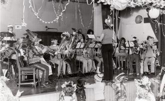 In 1973 etwa dürfte diese Aufnahme entstanden sein. Die Kinderkapelle des Musikvereins Reichelsheim spielte zum Kinderfasching auf. Der Musikverein als Veranstalter - seinerzeit um die 70 Mitglieder, war zur Faschingszeit auch musikalischer Begleiter der Maskenbälle und Kinderfaschingsnachmittage. Bis 1970 wurde Fasching in allen noch aktiven Gaststätten des Ortes und Kinderfasching im Gasthof zur Post gefeiert und gar manches Mal hatte man dort die Decke in der Wirtschaft unten herunterkommen sehen, wenn oben im Saal anständig getanzt und getobt wurde. Mit dem Neubau der Mehrzweckhalle Reichelsheim verlagerte sich das närrische Treiben, wie auch alle anderen größeren Veranstaltungen in die nun auch viel größere neue Halle, die auf der ehemaligen Lenzewiese errichtet wurde.