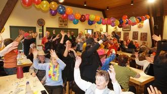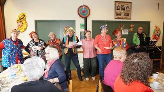 Pünktlich um 14:11 Uhr zog das erste Beienheimer Seniorenputzgeschwader in die geschmückte Narrhalla des ev. Gemeindehauses ein. Nach dem Einzugsmarsch absolvierten sie, zum Beruf passend, einen Besentanz. Vor dem Auszug eröffnete die Vorgesetzte der Truppe Ingelore Schudt mit närrischem Gruß diesen Nachmittag. Das Seniorenteam hatte ein tolles Programm zusammengestellt, welches bei den Nichtanwesenden am nächsten Tag schon närrische Ortsgespräche auslöste. Die ersten Ablaufpunkte waren ein Ständchen für alle Geburtstagskinder der vergangenen vier Wochen und speziell ein Tagesaktueller. Mit einem Büttenvortrag unserer Heidi Meinert aus Weckesheim fuhren wir im Traktor zum Shopping nach Gießen. Inzwischen war der Kaffee durchgelaufen und Alle holten sich beim Kräppelessen eine weiße Schnuud.