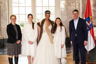 Blütenkönigin Naomi I. war beim Hoheiten-Empfang im Wiesbadener Schloss Biebrich bei Ministerpräsident Boris Rhein. „Die Vielzahl der Hoheiten zeigt die Vielfalt unseres Landes“ sagte Rhein am Samstag vor den rund 250 Gästen aus Hessen, denen er für den Einsatz in ihrer Gemeinde, ihrer Stadt, der Region, im Land Hessen und für das Werben um heimische Erzeugnisse dankte. „Ob Wein, Äpfel, Spargel, Erdbeeren, Kirschen und viele Produkte mehr – Hessen hat viel zu bieten. Dass die Amtsträgerinnen und Amtsträger diese Vielfalt nach außen tragen, ist ehrenwert und für die Regionen von unschätzbar hohem Wert. Sie alle sind wichtige Botschafter in unserem Land. Für diesen großen persönlichen Einsatz möchte ich ihnen ausdrücklich danken.“