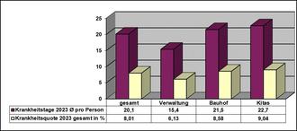 Leicht über dem Gesamtdurchschnitt der Bereiche Verwaltung, Bauhof und Sozial- und Erziehungsdienst i. H. v. 8,01 % liegen die Bereiche Bauhof mit 8,58 % und Sozial- und Erziehungsdienst mit 9,04 %. Die im Bereich der Kinderbetreuungseinrichtungen über dem Durchschnitt liegenden Einrichtungen stellen sich wie folgt dar: Kita Obergärten 13,80 %, Kita Bergstraße 10,44 % und Kita Hauptstraße 9,54 %.
