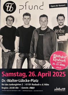 Am Samstagabend, 26. April 2025, ab 20.00 Uhr, wird die Bühne auf dem Dr.-Walter-Lübcke-Platz wieder beben. Die Rockband „Pfund“ spielt Songs aus den vergangenen vier Jahrzehnten.