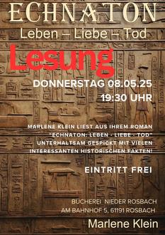 Am Donnerstag, den 8. Mai 2025, lädt die Stadtbücherei Rosbach zu einer besonderen Lesung ein: Die Autorin Marlene Klein liest aus ihrem historischen Roman „Echnaton - Leben, Liebe, Tod“.