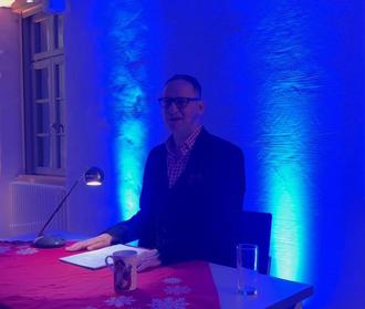 Unter dem stimmungsvollen Motto „Reingeschneit“ erlebten rund 60 Gäste am Dienstag, 10. Dezember 2025, eine ebenso humorvolle wie herzerwärmende Weihnachtslesung in der historischen Wasserburg. Der Frankfurter Kabarettist Jo van Nelsen schlüpfte dabei mit großer Wandlungsfähigkeit in verschiedene Rollen der legendären Familie Hesselbach und sorgte für beste Unterhaltung und viele Lacher.