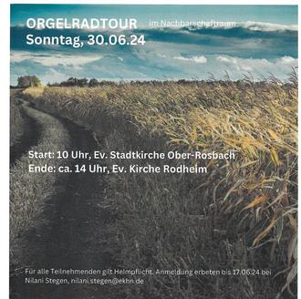 Für Sonntag, den 30.06.24 ist eine Orgelradtour (Helmpflicht!) geplant. Sie startet in Ober-Rosbach an der Stadtkirche mit einem Morgensegen, führt weiter zur Burgkirche nach Nieder-Rosbach und endet dann in der Rodheimer Kirche. In den Kirchen werden die Orgeln vorgestellt und gespielt. Die Radtour endet in Rodheim, wo es dann auch eine kleine Stärkung gibt.