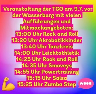 Am Sonntag, 09.07.2023, führt die TGO 3 Stunden von 13:00 Uhr bis 16:00 Uhr im Rahmen des Kultursommers an der Wasserburg durch das Programm. Es wird sportliche Mitmachangebote und Showauftritte aus dem Sportangebot der TGO geben.