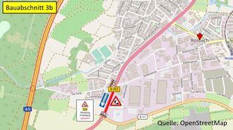Mit dem Wechsel in den Abschnitt 3b erfolgt dann ab dem 16.07. auch die bereits angekündigte Sperrung der Aus- und Einfahrt zur Straße "Die Sang". Die Einbahnregelung in Richtung Autobahn bzw. Bad Homburg bleibt wie bisher eingerichtet. Die Einmündung zur K 11 kann auch weiterhin sowohl aus als auch in Richtung Autobahn bzw. Bad Homburg befahren werden.