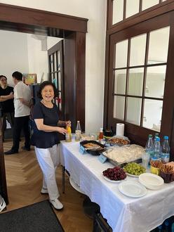 Moderatorin, Frau Baohe Ye, führte nicht nur durch das abwechslungsreiche Programm des Nachmittags, sondern bedankte sich in ihrer Rede auch im Namen ihrer Malerfreundinnen bei dem Kunst- und Kulturkreis Kraniche in Florstadt, bei der Stadt Rosbach v. d. Höhe und den Mitarbeiterinnen der Bücherei, der Jugendarbeit und Herrn Lorenz vom Senioren- und Inklusionsbeirat der Stadt. Als Präsente hatten die Künstlerinnen eine Überraschung vorbereitet: Eigens bemalte Fächer mit Signaturen für die Mitarbeiterinnen der Bücherei.