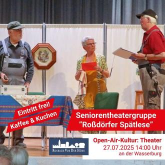 Am Sonntag, den 27. Juli um 14 Uhr heißt es wieder „Bühne frei“ für die „Roßdörfer Spätlese“ auf dem Gelände der Wasserburg in Nieder-Rosbach. Im Rahmen des Open-Air-Kulturprogramms präsentiert die Seniorentheatergruppe unter der Leitung des ehemaligen Kriminalpolizeibeamten Karl-Heinrich Braun, genannt „Charly“, ihr neues Stück zu aktuellen Betrugsmaschen. Mit viel Humor und einer gehörigen Portion Scharfsinn beleuchten die Laiendarsteller die Tricks der Betrüger und zeigen, wie man sich davor schützen kann – und das alles bei freiem Eintritt!