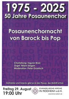 | 19.00 Uhr | Posaunenchornacht – Jubiläum 50 Jahre Posaunenchor Rodheim |