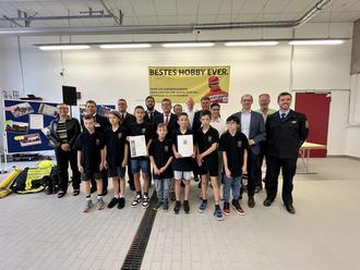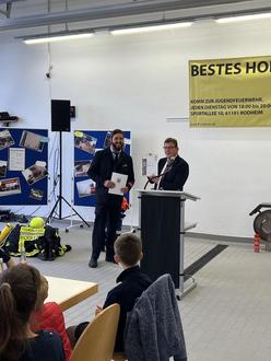 Die Ehrung erhält die Jugendfeuerwehr der Freiwilligen Feuerwehr Rodheim für die Durchführung einer Nachwuchskampagne, mit der nach der Corona-Pandemie erfolgreich neue Mitglieder für ein Engagement begeistert werden konnten. Als Anerkennung überreichte Stefan Sauer eine Prämie in Höhe von 1.000 Euro, beglückwünschte alle an der Nachwuchskampagne Beteiligten zu ihrem Erfolg und dankte den Feuerwehrangehörigen in Rodheim für ihren ehrenamtlichen Einsatz für den Brandschutz in der Kommune.