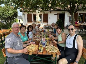 Die Genussradler des RV 1911 machten sich auch in dieser Saison wieder auf den Weg nach Frankfurt zur Äpfelwein-Botschaft. Vom Rosbacher Bahnhof ging es über Petterweil und Harheim an den Nidda-Radweg. Trotz der hohen Temperaturen war die Fahrt entlang der Nidda bis nach Frankfurt-Rödelheim sehr angenehm. Die schöne renaturierte Landschaft und die Licht-Schatten-Spiele am Fluss erfreuten dabei die Radler. Nach circa 30 Kilometern wurde die „Äpfelwein-Botschaft“ auf dem Possmann-Gelände erreicht. Dort genossen die Radler dann im idyllischen Garten unter großen Bäumen die regionalen Speisen und Getränke und hatten wieder viel Spaß. Auf dem Rückweg entlang der Regionalpark-Rundroute über Eschborn und Weißkirchen nach Bad Homburg wurde nur kurz gestoppt, um den großartigen Blick auf die Frankfurter Skyline zu genießen. Denn die Hitze war beim Fahren recht gut zu ertragen, in den dringend erforderlichen Trinkpausen jedoch weniger gut. Nach knapp 60 Kilometern kamen die Genussradler dann wieder in Rosbach an und vereinbarten, diese wunderschöne Tour auch in der nächsten Saison wieder ins Programm zu nehmen.