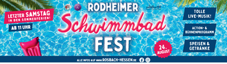 In diesem Jahr ist es nun endlich wieder soweit: Rosbach feiert sein traditionelles Schwimmbadfest in altbewährter Form am letzten Ferienwochenende der Sommerferien! Der Magistrat der Stadt Rosbach v. d. Höhe veranstaltet zusammen mit den Rodheimer Weihnachtsmännern und der Tanzgarde Rodheim ein buntes, spaßiges Schwimmbadfest im neu renovierten Freibad in Rodheim.