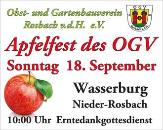 Nach zwei Jahren corona-bedingter Pause freut sich der OGV Rosbach wieder auf sein beliebtes, traditionelles Apfelfest! Es findet statt am Sonntag, den 18. September ab 10:00 Uhr am Festplatz an der Wasserburg in Nieder-Rosbach. Eingeleitet wird die Veranstaltung mit einem Erntedankgottesdienst. Ab 12:00 Uhr gibt es „Show-Keltern“ von frisch gepresstem Apfelsaft. Für das leibliche Wohl ist bestens gesorgt.
