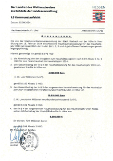 Die nach §§103 Abs. 2 und 105 Abs. 2 HGO erforderlichen Genehmigungen der Aufsichtsbehörde zu den Festsetzungen in den §§ 2 und 4 der Haushaltssatzung sind erteilt. Der Wortlaut der Genehmigungen wird nachfolgend öffentlich bekannt gegeben.