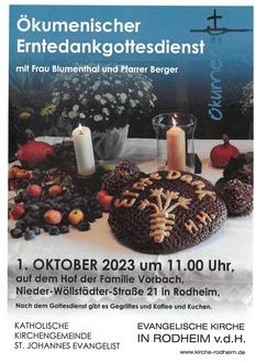 | 11.00 Uhr | ökum. Erntedankgottesdienst auf dem Hof Vorbach, Nieder-Wöllstädter Str. 21 |