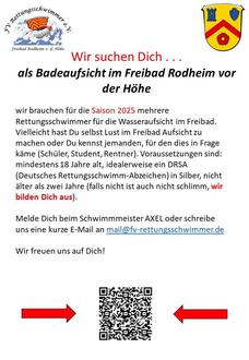 Der Förderverein Rettungsschwimmer sucht in Vorbereitung auf die kommende Badesaison im Freibad Rodheim engagierte Rettungsschwimmer zur Verstärkung des Teams. Geeignet sind verantwortungsbewusste Personen ab 18 Jahren, die Interesse an einer Tätigkeit im Bereich der Wasseraufsicht haben.