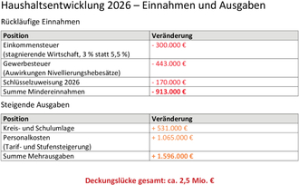 Das bedeutet für den Haushalt 2026, dass wir unsere Kreditaufnahme 2026 grundsätzlich um diesen Betrag kürzen müssten. Da diese für 2026 mit genau 3.500.000 Euro angesetzt waren, wäre die Kreditaufnahme in 2026 dann mit NULL zu bewerten, falls wir die gesamten Mittel in 2026 erhalten.