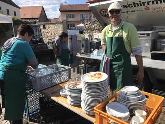 In diesem Jahr verzichtete der Verein erstmals vollständig auf Plastik- und Pappgeschirr. Ermöglicht wurde dies durch den Einsatz eines Spülmobils. Damit sei der OGV, so die beiden Vorsitzenden Bernd Giar und Hans-Martin Blüder, der erste Verein in der Region, der bei einer derartigen Veranstaltung Speisen in Porzellangeschirr und mit Metallbestecken anbiete. Selbstverständlich gab es auch den Äppler im klassischen Gerippten aus Glas. Die Resonanz bei den Besuchern war überaus positiv und der Verein wird weiterhin ein Spülmobil einsetzen, auch wenn damit ein organisatorischer Mehraufwand verbunden ist. Immerhin waren mehr als 40 ehrenamtliche Helferinnen und Helfer für das Gelingen des Apfelfests im Einsatz.