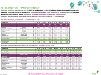 Die RB12 wird in der Zeit vom 3. bis 21. November 2024 jeweils von Sonntag bis Donnerstag zwischen 20:30 Uhr und 04:00 Uhr gesperrt. Grund hierfür sind Rückschnittarbeiten entlang der Strecke. Ein Schienenersatzverkehr (SEV) mit Bussen ist zwischen Königstein und Frankfurt Höchst eingerichtet. Fahrgäste werden gebeten, die geänderten Abfahrtzeiten der Ersatzbusse zu beachten, sowie zwischen Frankfurt Höchst und Frankfurt Hbf auf die S1 auszuweichen.
