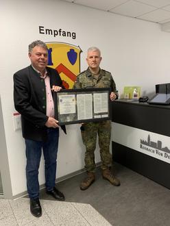 Die Stadt Rosbach v. d. Höhe ist neuer Partner des Landeskommandos Hessen im Rahmen der Initiative „Partnerschaft Heimatschutz und Gesamtverteidigung“. Am 21. Oktober 2025 überreichte der gespiegelte stellvertretende Kommandeur und Chef des Stabes des Landeskommandos Hessen, Oberst Egerter, Bürgermeister Steffen Maar im Rosbacher Rathaus die entsprechende Urkunde.