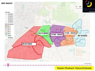 Nun werden insbesondere in Nieder-Rosbach in den Bauabschnitten „grün“, „lila“ und „orange“ (s. beigefügter Plan) die Arbeiten zur Verlegung der Haupttrassen aufgenommen.
