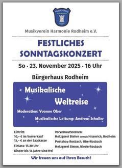 Es ist wieder soweit - der Countdown läuft in die finale Runde. Die Vorbereitungen sind im vollen Gange. Am Sonntag, den 23.11.2025 findet um 16:00 Uhr das schon traditionelle „Festliche Sonntagskonzert“ des Musikvereins Harmonie Rodheim e. V. im Bürgerhaus Rodheim statt. Einlass ist ab 15:30 Uhr.