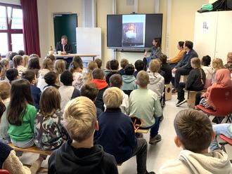 Anschließend war der 4. Jahrgang an der Reihe, der ebenfalls gespannt der Geschichte von Larson lauschte. Nach dem Vorlesen hatten die Kinder die Möglichkeit, allgemeine Fragen an den Bürgermeister zu stellen. Herr Maar beantwortete ausführlich alle Fragen, unter anderem: „Wie wird man Bürgermeister?“, „Welche Aufgaben hat ein Bürgermeister?“, „Seit wann sind Sie Bürgermeister?“ und „Was sind Ihre Hobbys?“. Die Antworten des Bürgermeisters stießen auf großes Interesse und wurden von den Schülerinnen und Schülern neugierig aufgenommen.