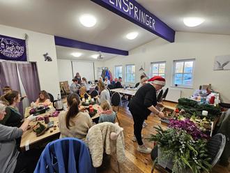 Anschließend übernahm Patrizia Fleischmann, die den kreativen Nachmittag leitete. Mit einer beeindruckenden Auswahl an Kränzen, Naturmaterialien wie Moos, Tannenzapfen und Hagebutten sowie einer Fülle an Kerzen, Bändern und Kugeln inspirierte sie die Teilnehmenden. Mit viel Geduld und praktischen Tipps stand sie allen zur Seite, sodass am Ende jeder ein kleines Kunstwerk mit nach Hause nehmen konnte. Besonders erfreulich war die Begeisterung der acht anwesenden Kinder, die mit großem Eifer ihre eigenen Gestecke gestalteten.