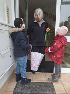 Mit einem Bollerwagen ging es los in den Ahornring. Die Kinder klingelten aufgeregt an den Türen und warteten gespannt darauf, ob wohl jemand öffnet.