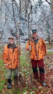 Da im Rosbacher Stadtwald viele Bäume und Sträucher unter der Trockenheit der vergangenen Monate gelitten haben, investiert Heinz Sill das Preisgeld in die relativ seltenen Wildäpfel und Wildbirnen. Die beiden Gehölze bevorzugen wärmere Lagen und Standorte und können sich somit gut an die veränderten klimatischen Bedingungen anpassen. Zusammen mit Bürgermeister Steffen Maar pflanzte er mehrere im Rodheimer Oberwald.
