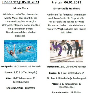 An zwei weiteren Tagen wird dann für Action gesorgt. Es geht in das Schwimmbad „Monte Mare“ sowie in die Eissporthalle nach Frankfurt.