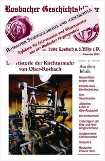 Schwerpunkte des neuen Heftes (Jahrgang 2023) bilden die Chronik des Familienbetriebs Storck sowie der zweite Teil der Artikelserie Jüdisches Leben in Ober-Rosbach. Die 44-seitige Broschüre mit zahlreichen, meist farbigen Abbildungen erinnert aber auch an so profane Traditionen wie Hausschlachtungen und Sauerkraut-Einlagerung. Pfarrer Schäfers Schilderungen der trüben Tage widmen sich diesmal den Heimsuchungen der hiesigen Bevölkerung durch die Kriegsereignisse vom Dreißigjährigen Krieg bis zu den Revolutionskriegen. Schließlich gehen Beiträge der verwinkelten Baugeschichte der Ober-Rosbacher Kirchturmuhr und ausgestorbenen Familiennamen nach.