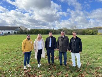 Gaben gemeinsam den Startschuss für die Akquisephase des neuen Ärztehauses Rosbach: (v.l.n.r.) Roberto Vizoso Capiali und Rebekka Kreiling (beide COCARING KG), Manuel Preis (HP&P Gruppe), Bürgermeister Steffen Maar und Denis Grosch (Fachbereichsleiter Stadtplanung und Immobilien).