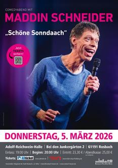 Am 5. März 2026 dürfen sich alle Comedy-Freunde in Hessen auf ein besonderes Programm in Rosbach v. d. Höhe freuen: Maddin Schneider kommt um 20 Uhr in die Adolf-Reichwein-Halle und beansprucht garantiert die Lachmuskeln aller Gäste!