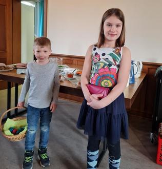 Luca und Romy beim Ostereierverkauf im Gemeindehaus beim Osterfrühstück.