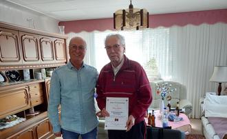 Das vielseitige interessierte und kommunalpolitisch sehr erfahrene Kolpingsmitglied freute sich über unsere Aufwartung, war er doch im vergangenen Jahr gesundheitlich ziemlich angeschlagen. Nach einer längeren erfolgreichen Rekonvaleszenz befindet er sich gottseidank wieder auf dem Wege der Besserung. Nicht nur an Lebensjahren zählt Hans zu unserem ältesten Mitglied. In diesem Jahr feiert er seine 64-jährige Mitgliedschaft. Innerhalb der Kolpingsfamilie unterstützte er in den Anfangsjahren der unserer Kolpingsfamilie die Vorstandsarbeit und war lange Jahre aktives Elferratsmitglied unserer Gemeinschaft. Auch außerhalb der Kolpingsfamilie engagierte sich Hans viele Jahrzehnte kommunalpolitisch für unser Dirmingen im Gemeinderat Eppelborn, begleitete zudem das Amt des 2. Beigeordneten in der Gemeinde Eppelborn und war nach der Gebiets- und Verwaltungsreform im Jahre 1973 der erste Ortsvorsteher von Dirmingen von 1974 bis 1979. Mit seinem ausgeprägten sachpolitischen Verstand und seiner weitreichenden kommunalpolitischen Erfahrung war er prägend für seinen Heimatort Dirmingen.