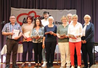 Erstmals in der Geschichte des Blutspendewesens des DRK konnten bei diesem Empfang auch Menschen geehrt werden, die seit vielen, vielen Jahren stets ehrenamtlich dafür sorgen, dass eine Blutspende erst durchgeführt werden kann. So wurde für 10 Jahre Mitarbeit bei der Blutspende geehrt Frau Claudia König und Frau Edeltraud Lässig. Für 20-jährige Mitarbeit Frau Anni Deutscher und Frau Heike Deutscher, für 30-jährige Mitarbeit Frau Ursula Steinbach, für 40-jährige Mitarbeit Frau Christel Theobald und für 50 Jahre Mitarbeit bei der Blutspende (in Abwesenheit) Frau Agnes Naumann. Auch diesen Menschen gebührt Dank und Anerkennung.